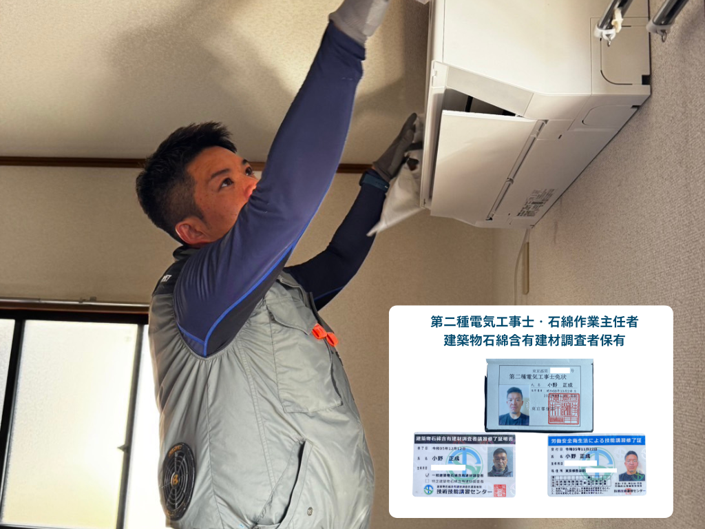 第二種電気工事士、アスベスト作業主任者、アスベスト調査者など、専門資格を持つスタッフが責任を持って対応。