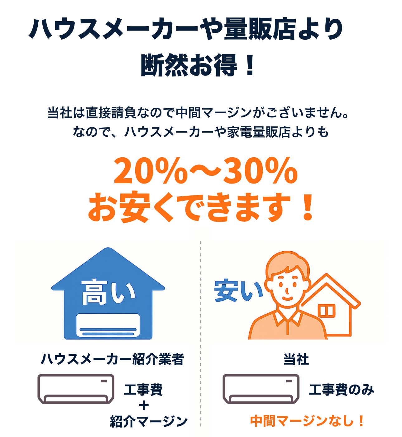 量販店やハウスメーカー経由だと、中間業者や紹介料が発生してしまい、どうしても料金が高くなります。当社は外注なしの完全自社施工のため、余計なコストをカットし、その分料金をお安くすることができます。