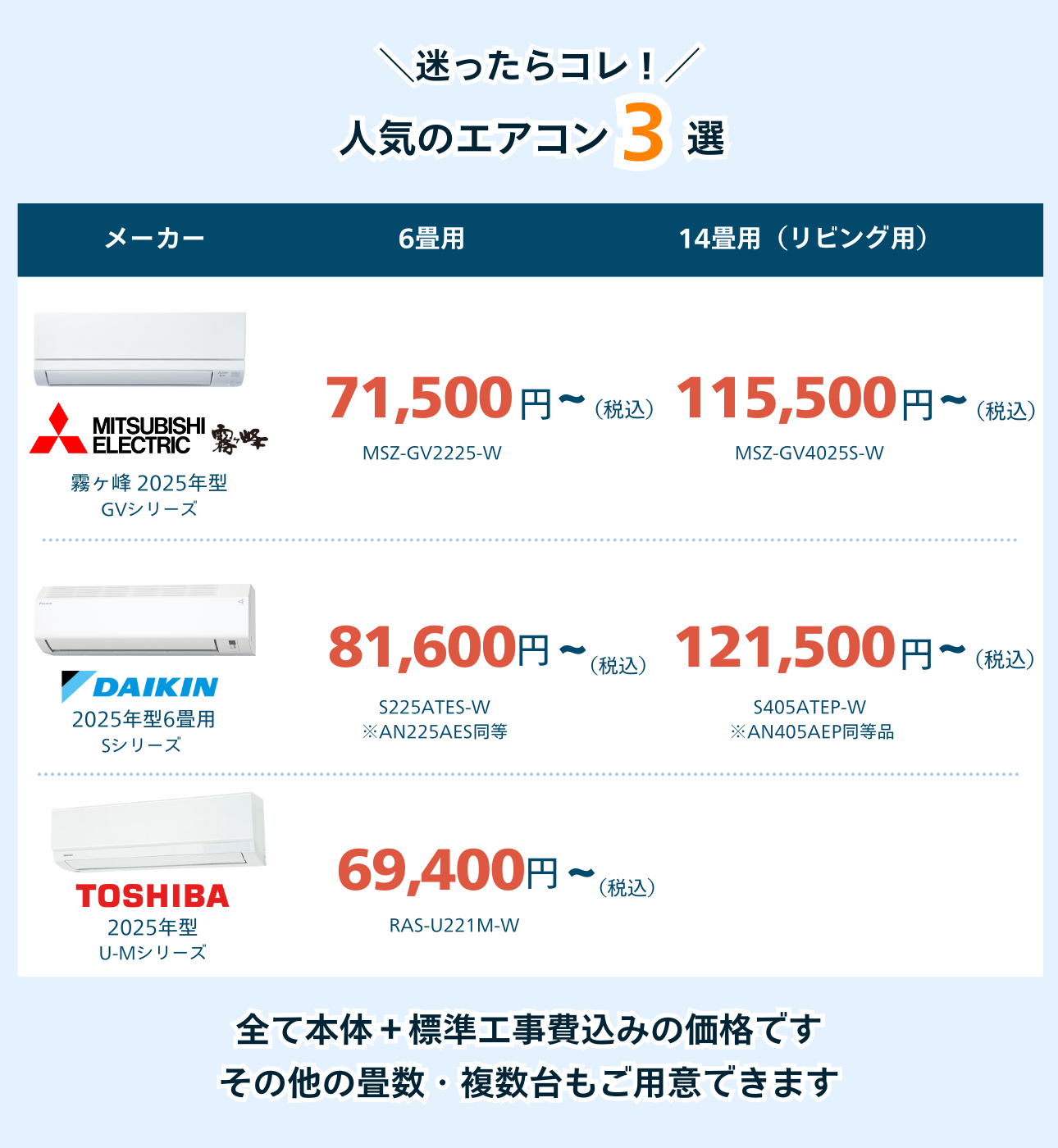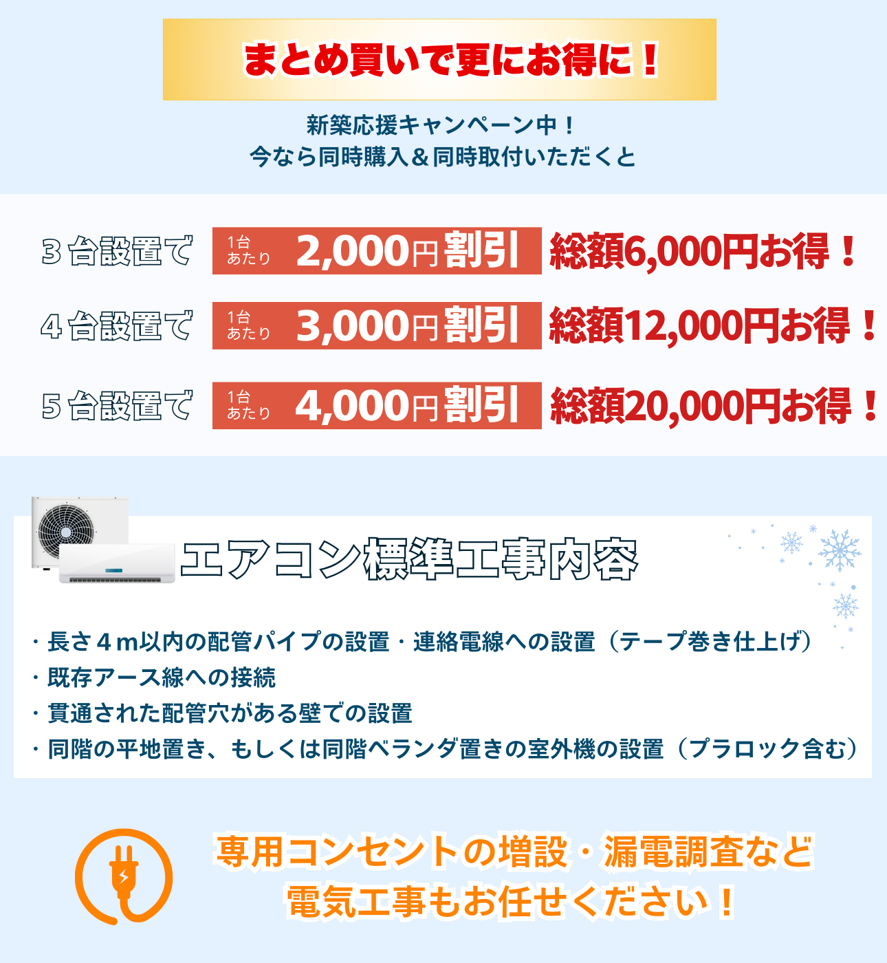 はい、施主支給も可能です。ネットや量販店で購入されたエアコンも取付対応いたします。